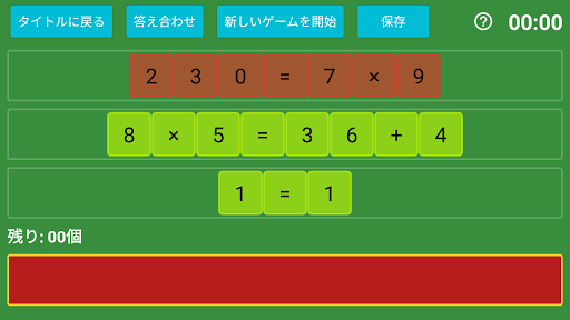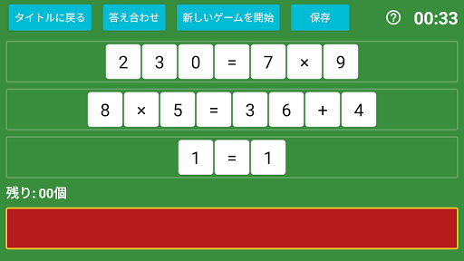 2分間の制限時間の間に、それらの数字や演算子記号と、もともと配置されている3つの「=」に関して、余りが少なくなるような式を考えてください。(※ほとんどの出目で、すべて使い切る解が1つ以上存在します。)