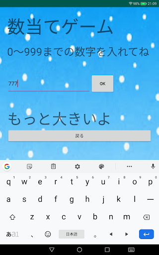 0〜999までの数値の中からランダムに選ばれた数値を当てるために数値を入力してOKするともっと大きいかもっと小さいかそれともその数値があってるか下に表示されます