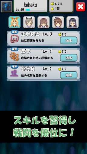 キャラクターは敵を倒せば倒すほど強くなっていきます。手に入れたコインでスキルを習得させさらに強化させていきましょう!各キャラクターには専用のスキルがあり特徴を使いこなし強力な敵たちを倒しステージを進めましょう!