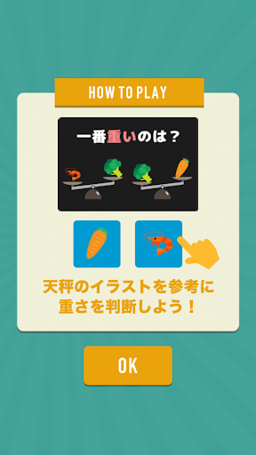 イラストをヒントに、お題の重さのものをタップするだけ。