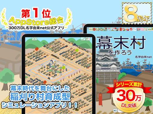 名字(苗字)に興味のある方もない方も、自分の名字を冠した村を成長させ、日本一の村を作っていくゲームです。ランキングでは日本中で最も強い村と村の発展を競うことができます。家族が少人数化していく現代だからこそ、稲を刈り自分の家族を増やし、村が大きくなる醍醐味を体験しましょう。大ヒットゲーム「弥生村を作ろう」「戦国村を作ろう」「世界村を作ろう」に続く第四弾、激動の幕末を舞台にした「稲刈り村育成型シミュレーションアプリ」です。