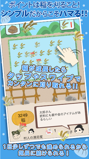稲は何もしなくても自動で成長します。成長した稲はタップやスワイプで刈り取ります。稲を刈り取ると米俵に収穫され、稲ポイントが貯まります。