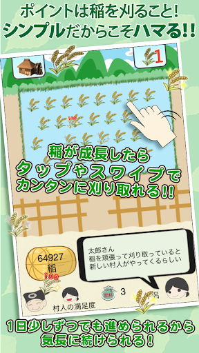 稲は何もしなくても勝手に成長します。成長した稲はタップやスワイプで刈り取ります。稲を刈り取ると米俵に収穫され、稲ポイントが貯まります。
