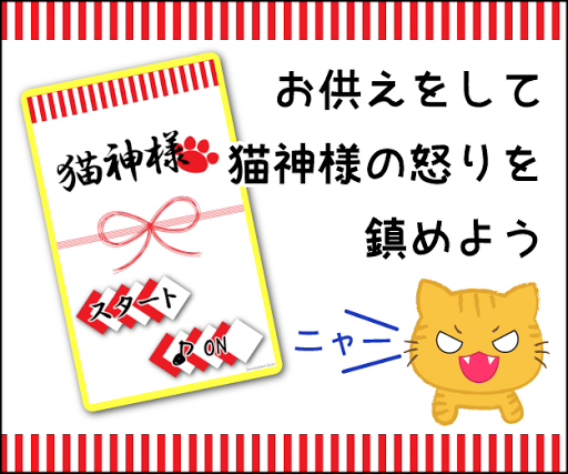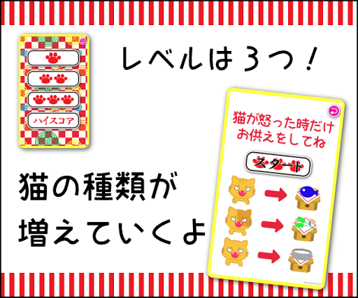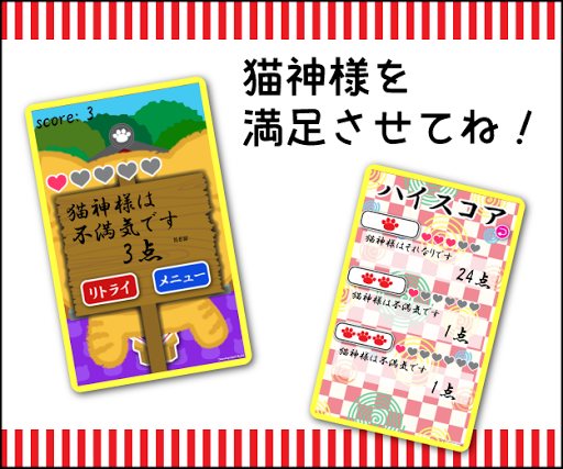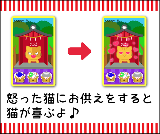 怒っている猫神様にはお供えをあげ、ごきげんや寝ている猫神様はそっと通りすぎるのを待つ反射神経がとわれるゲームです!