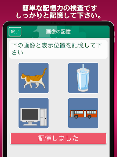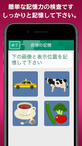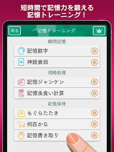 続けて表示される絵を記憶して順番にタップ!瞬間記憶のトレーニングに最適。