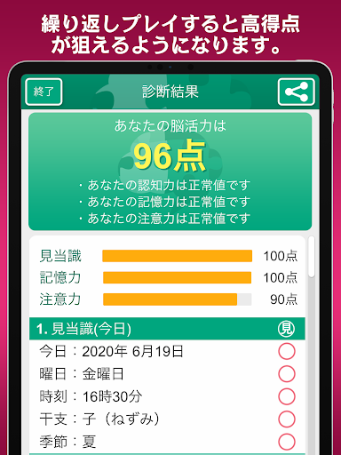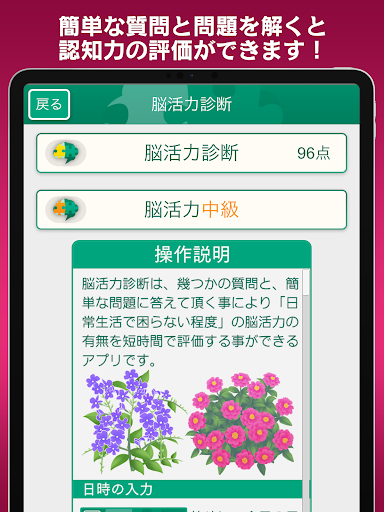 幾つかの質問と、簡単な問題に答えて頂く事により「日常生活で困らない程度」の脳活力の