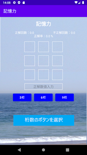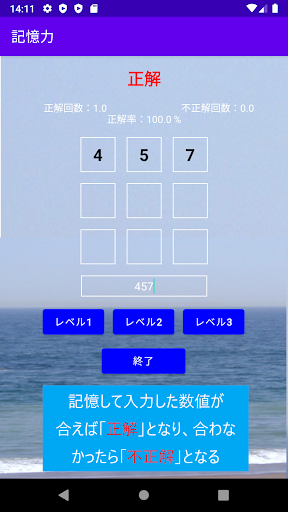 レベルボタンを押すと次に桁数ボタンが表示され「3桁」、「6桁」、「9桁」、があり、自分のレベルに応じた桁数を選ぶと、すぐに選んだ桁数がマスに表示されるので、その数値を記憶して、下部の「正解数値入力」欄に数値を入力する。表示された数値と記憶して入力した数値が合えば「正解」となり、合わなかったら「不正解」となる。不正解の時は、マスに表示された数値の合っていないところが赤色に表示される。終わればまたレベルボタンが表示されるので次の挑戦をする。