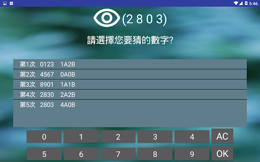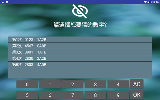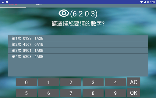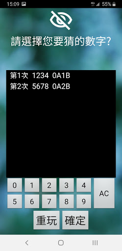 2.程式會根據您的猜測值回報AB數量,數字及位置皆正確為 A,僅有數字正確則為 B。例如:正確值為0123,您輸入0136,則會出現2A1B。