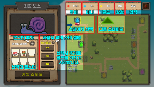 8. 플레이 중 몬스터 레벨업 시 소환돼있는 몬스터의 레벨은 증가하지 않습니다. (새로 뽑는 몬스터만 레벨에 맞는 능력치를 가지고 있습니다.)