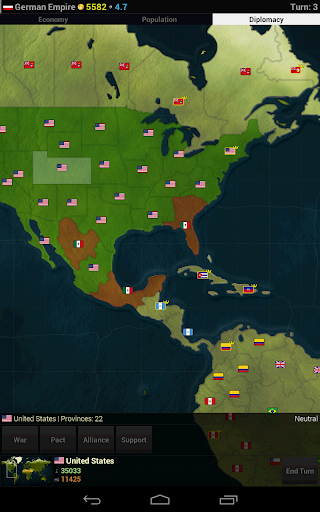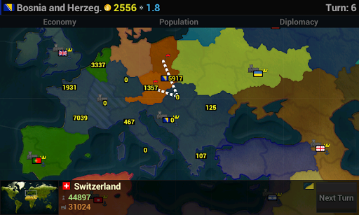 – Use the Economy and Population buttons to view each province’s Economy and Population values. Use the diplomacy button to view each province’s owner and engage in diplomacy (see Orders- Diplomacy View).