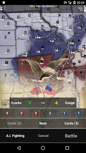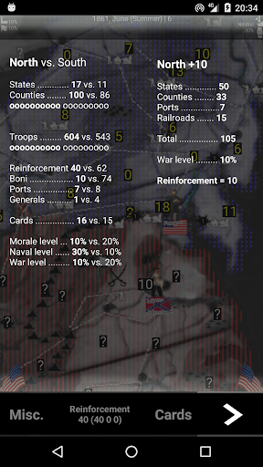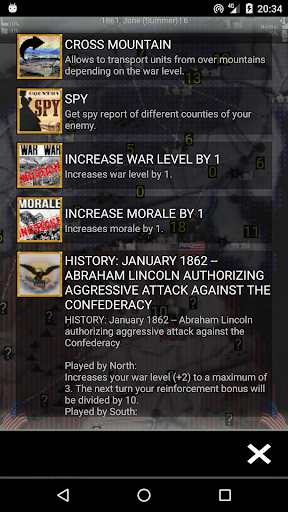 The goal of this Turn-based grand strategy wargame is to control all states of the USA when you play North. If you play South, you need to survive 50 turns to win. A game last about 2 hours.