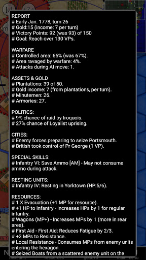 You are in command of the ragtag US armies during the American Revolutionary War (1775–1783). The object of the game is to fight off British forces and control enough cities to be able to claim independence. Events threatening the colonies include raids by Iroquois warriors, uprisings by royalist units, and Hessians and British forces landing on your shores.