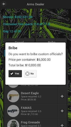 Each city will have weapons available at the market. The market may not have all weapons available. You can only sell a weapon if it’s available at that market. Each city you visit will take 1 days travel. Before traveling to a city, you can bribe ($5000 per container) customs to not inspect your container. Random inspections will be held and if your weapon cache is discovered, it will be seized and destroyed.