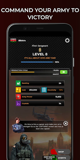Step into the ultimate experience of MMO War games with Army Tycoon. Manage your army and build your own powerful empire. Army Tycoon is the best MMO military game on a massive real world map, managing a real time strategy in the war zone. Build your army and join players from all over the world in the most challenging PVP and PVE combat! Fight your enemies, defend your army, gather resources and plan brilliant strategies to defeat all resistance!