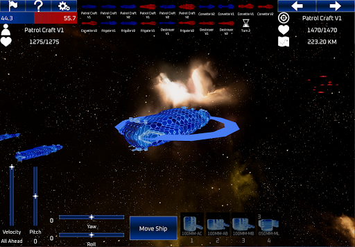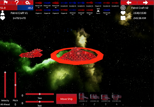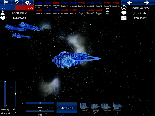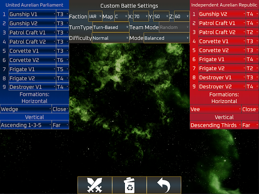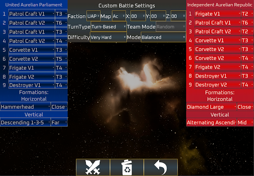 Includes a custom battle mode to configure user created battles with full customization of a fleet battle simulator. Enjoy a vast variety of configurations to create your own 9v9 battle simulation. Chose from 19 different battle deployment settings that include: Random, Head-2-Head, Chase/Chased, Back-2-Back, 2x Parallels, 4x Flanks, 8x Obliques with advantageous and disadvantaged positions.