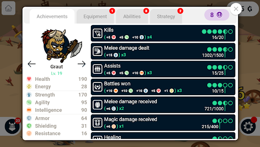 Hero’s level up whenever they finish an achievement. Achievement can be earned during combat and will strengthen your hero as well as unlock new abilities.