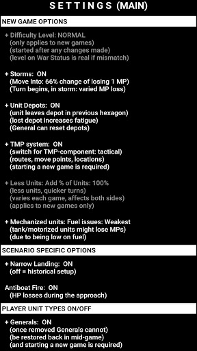 + Settings: Various options are available to alter the look of the gaming experience: Change difficulty level, choose icon set for units (NATO or REAL) and cities (Round, Shield, or Square), decide what is drawn on the map, change font, unit and hexagon sizes.