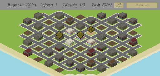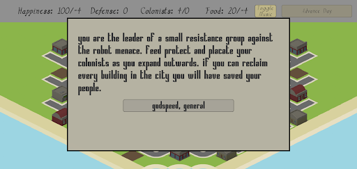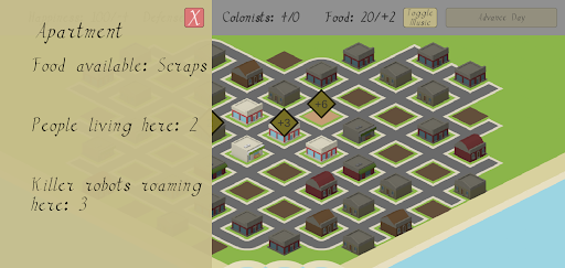 Vicious automatons plague the land in every direction, but you cannot let them have it. Send your people out to get food and recruit human stragglers. If you have the skill you may even vanquish them and claim a building for your own.
