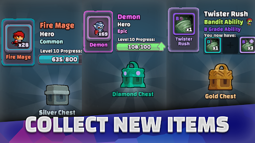 Bit Battles gameplay is completely idle, meaning you can climb up the leaderboards and collect coins in your sleep! Play while you watch TV! Play while you sleep! Play while you play Bit Battles on another device! Check back later and enjoy the loot your heroes have been collecting!