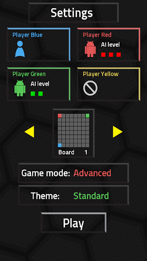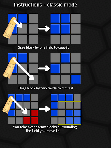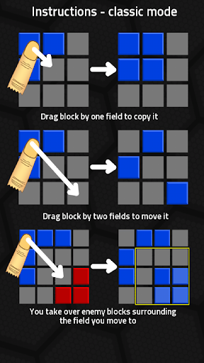 The aim of the game is to conquer whole board game (8×8). If you drag your piece by one field it will copy itself, if you drag it by two fields it will move. If destination field is surrounded by enemy pieces they will become your pieces. It allows a fast pace game with frequent changes of a leader.