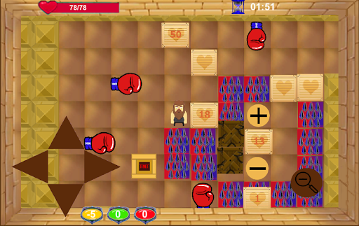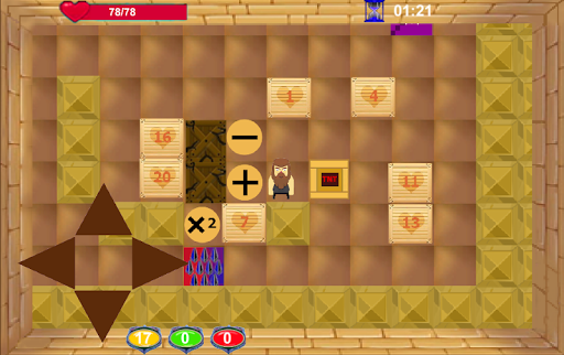 Box Pusher is a mind game where you push boxes with diffrent numbers and colors to the right spots (“+”)(“-“)(“x”) , you have 3 numbers of diffrent colors and you must make the required numbers equal to 0 , but be aware that tou can only push boxes and not pull them back.