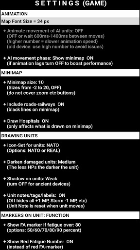 + Settings: Various options are available to alter the look of the gaming experience: Change difficulty level, hexagon size, Animation speed, choose icon set for units (NATO or REAL) and cities (Round, Shield, Square, block of houses), decide what is drawn on the map, and much more.