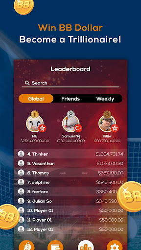 –	Leaderboard system: the rank of players in the world, friend list, and on a weekly basis; By climbing up the leaderboard, you can socialize with and befriend one another of the same level of your net worth