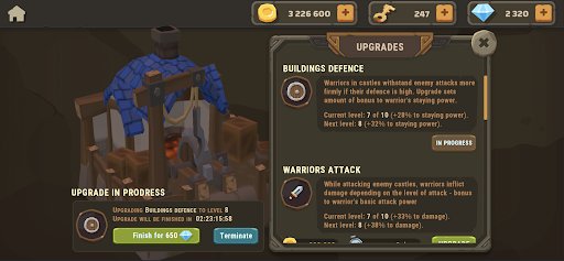 – Upgrade your buildings by increasing the capacity, growth rate of warriors and building defence