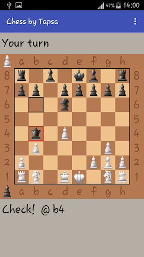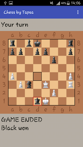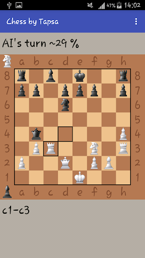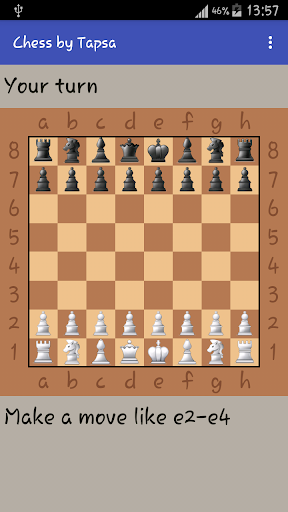 In this chess game you play against artificial intelligence. You can set the difficulty level by choosing how many moves you want the AI to think forward. Moves are given with touch input.