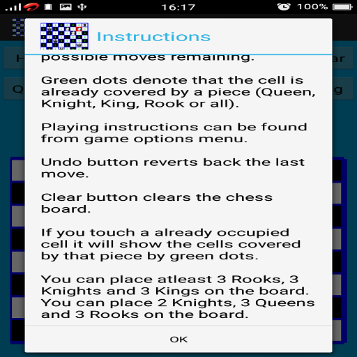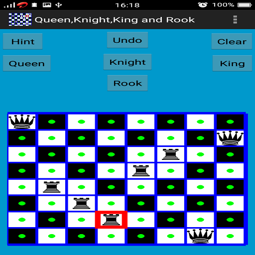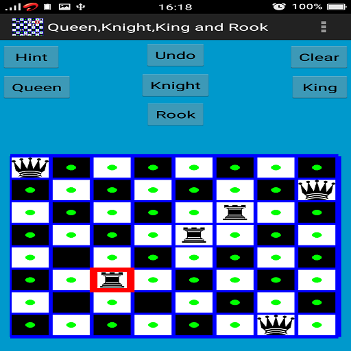 Green dots denote that the cell is already covered by a piece (Queen, Knight, King, Rook or all).