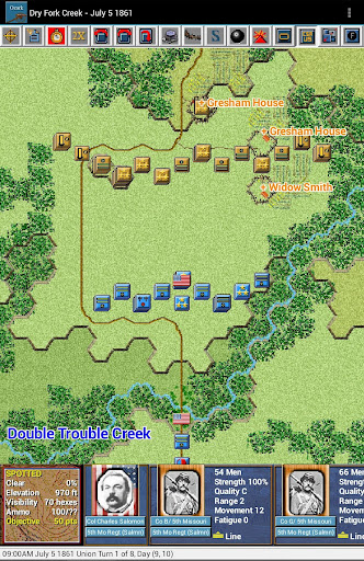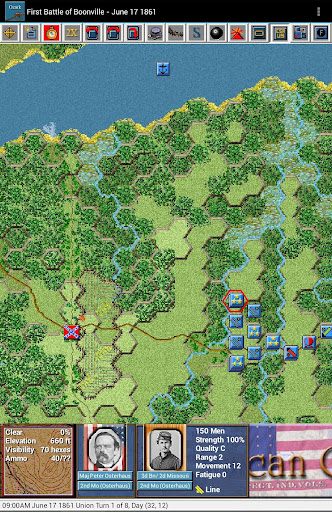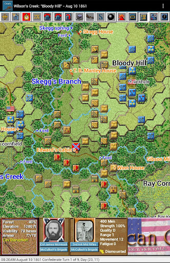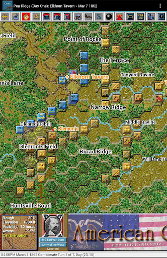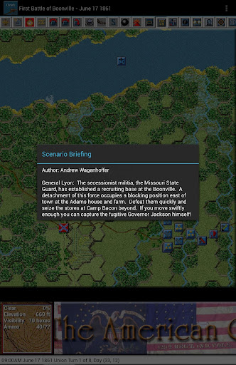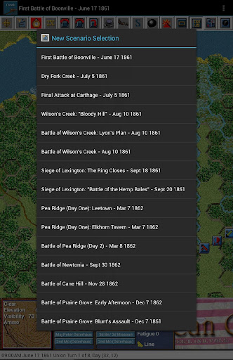 This is the fourth paid release in the touch Civil War Battles series. The 15 scenarios in this release cover, in part or in whole, the 1861–62 Missouri and Arkansas battles of Boonville, Carthage, Wilson’s Creek, Lexington, Newtonia, Pea Ridge, Cane Hill and Prairie Grove. You should first install and play the free Civil War Battles app to test the game engine on your device and become familiar with the interface.