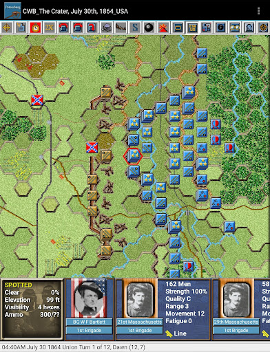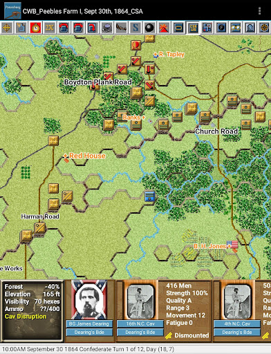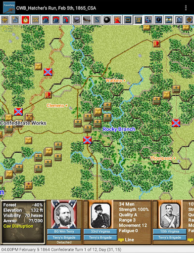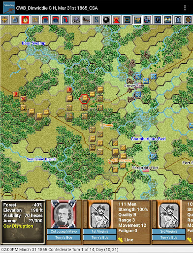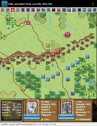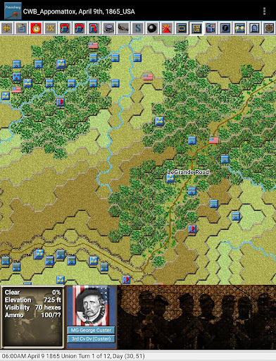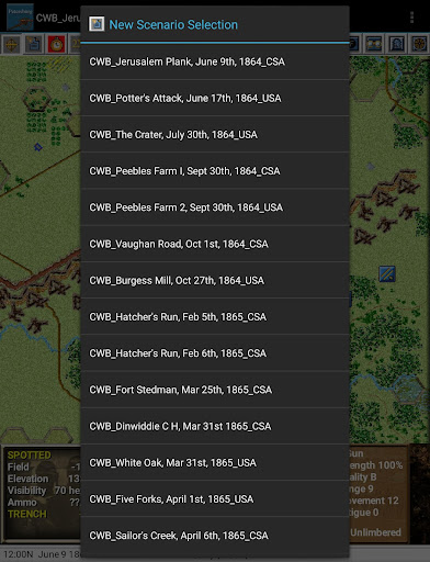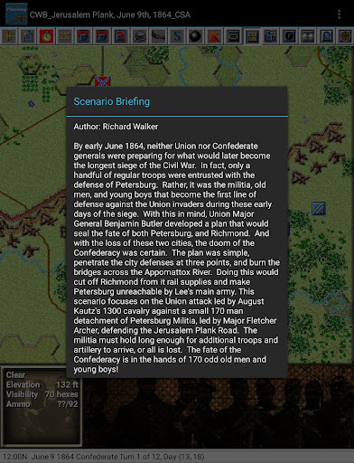 This release includes 16 Civil War scenarios from the Petersburg campaign including the final battles leading up to Appomattox. You play as the Confederate commander in 8 scenarios and as the Union commander for 8 scenarios. You should first install and play the free Civil War Battles app to test the game engine on your device and become familiar with the interface.