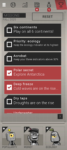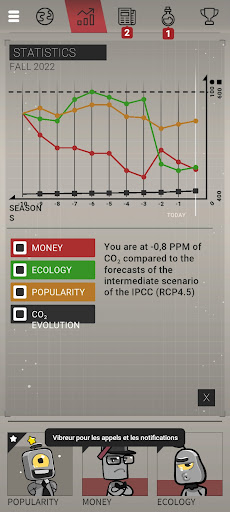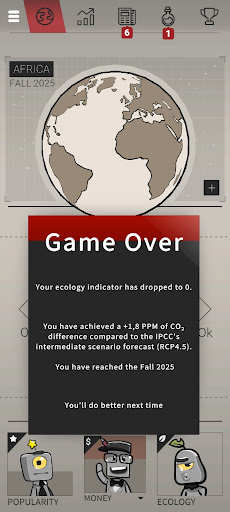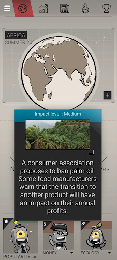 ClimarisQ is a smartphone/web game from a scientific mediation project that highlights the complexity of the climate system and the urgency of collective action to limit climate change. It is an app-game where players must make decisions to limit the frequency and impacts of extreme climate events and their impacts on human societies using real climate models. In the game: 1) make decisions on a continental scale and see the impact of these decisions on the economy, politics and the environment. 2) deal with extreme events (heat waves, cold waves, heavy rainfall and drought) generated by a real climate model. 3) try to balance the “popularity”, “ecology” and “finance” gauges as long as possible. Fullfill all the missions to explore different climates.