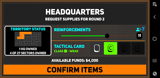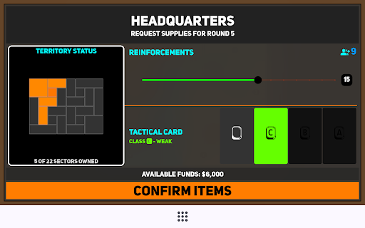 Use the wealth obtained from conquering other territories to buy reinforcements and even tactical cards to gain the edge over the other teams! Capture enemy HQs to deny them further reinforcements and to finish them off!