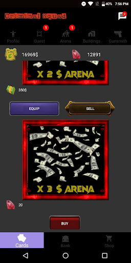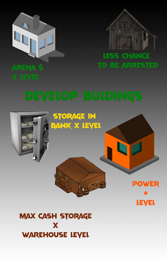 Développez les différents bâtiments et vous pourriez ainsi gagner plus d’argent dans l’arène, diminuer vos chances d’être arrêté ou avoir plus de puissance pour combattre les autres joueurs.