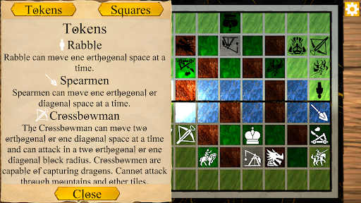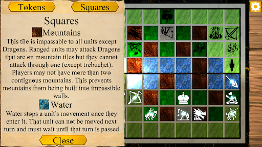 – Trebuchet can move two orthogonal or one diagonal space at a time and can attack in a 4 orthogonal or 3 diagonal block radius. Trebuchet capable of capturing dragons. Cannot attack through mountains and other tiles.