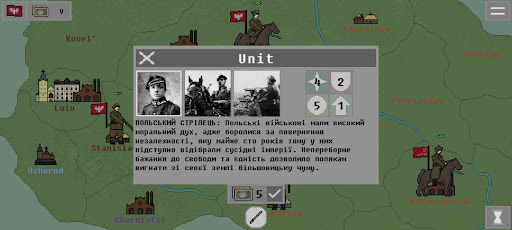 The player can play for the Ukrainian People’s Republic, the Crimean Democratic Republic, Poland, the Anarchists, Austria-Hungary, and the German Empire. Each country in the game has its unique set of units with special characteristics (attack power, health, price, and the number of moves on the map per turn), which makes the game for different countries more diverse and interesting.