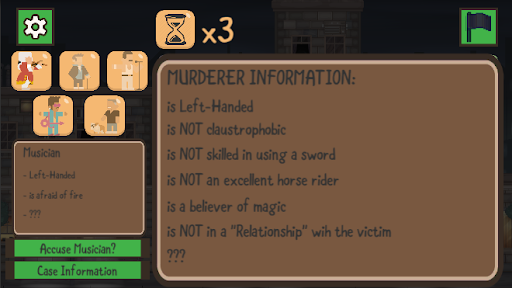 Before time runs out, you have to get enough clues to identify the murderer. Depending on your pick and the number of clues you gather, your reputation will increase or decrease after the case. Games end when your reputation hit zero or you choose to retire.
