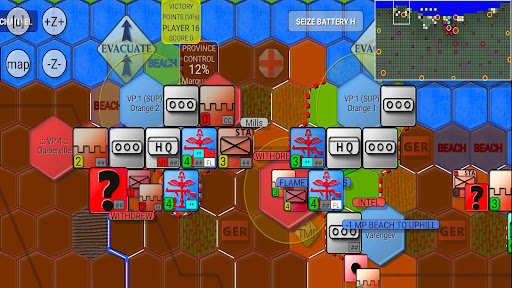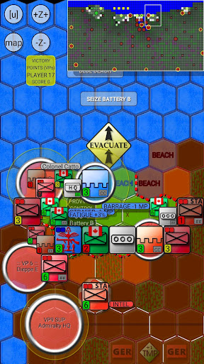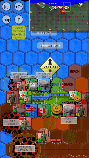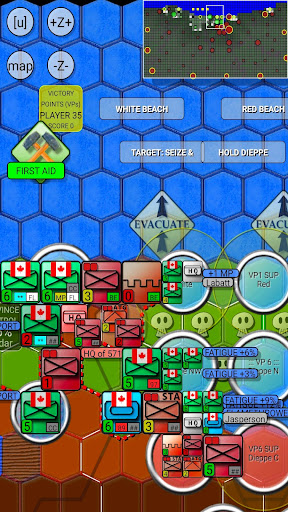 You are in command of the Allied force carrying out the 1942 raid on the port town of Dieppe. The aim is to capture as much of the nearby area as possible, hold it for a while, and evacuate before the Germans gather their elite divisions in this coastal area for a counter-strike. Your score will reflect both the cumulative VPs collected and the number of units evacuated successfully.