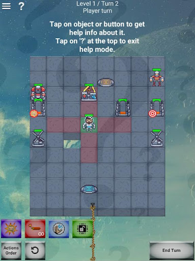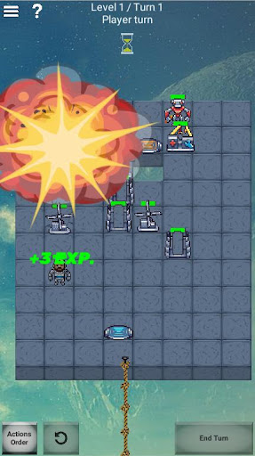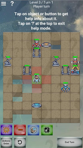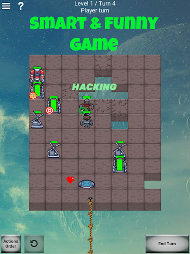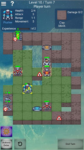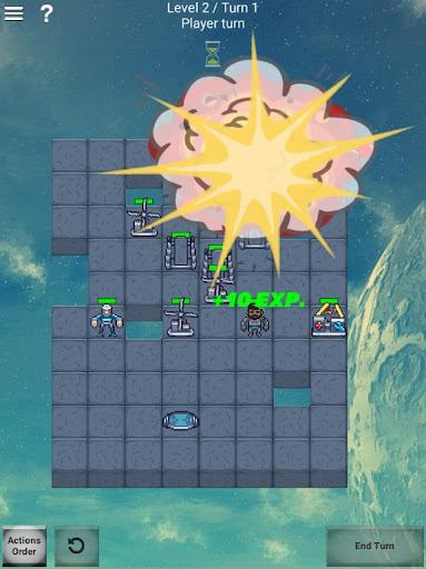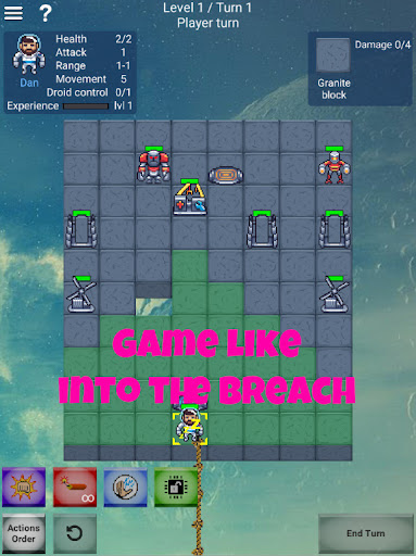 Like in Into the Breach you can control various units, like Pusher (close combat fighter), who can attack adjacent tile; Bomber and Shooter (units of distant support), Kamikaze, who blow himself destroying everything around; and various types of support units, who can repair, cast shields and so on. Moreover, destroyable tiles of various strength every round create different configurations of the game field. All this diversity gives an infinite number of unique game situations. This makes Droid Mania even more replayable than chess!
