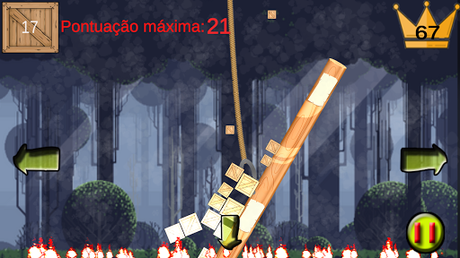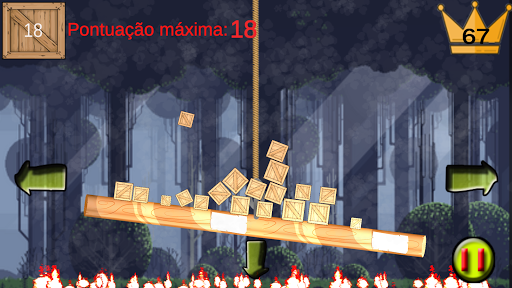 Empilhe numa plataforma o maior número possível de caixas antes que a plataforma perca o equilíbrio e todas as caixas caiam no fogo que está logo abaixo da plataforma.