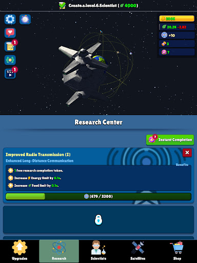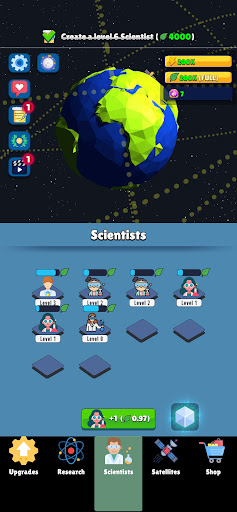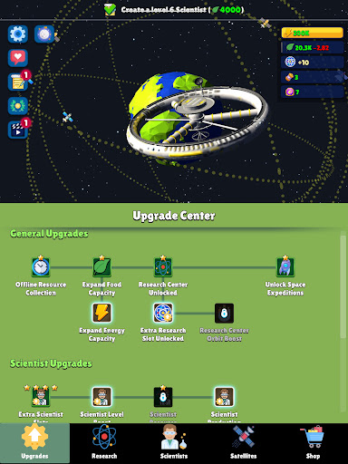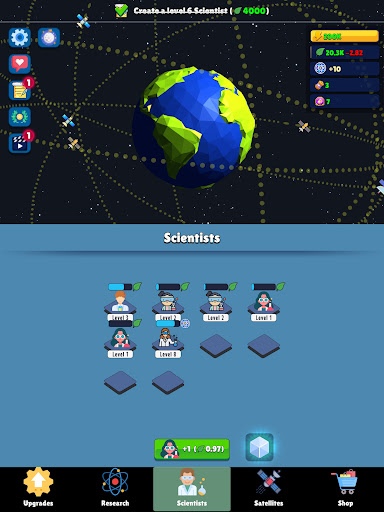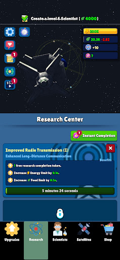 Discover the wonders of space in this immersive idle game that blends captivating storytelling with addictive gameplay mechanics. Merge scientists to level them up and unlock a variety of resources like food, science, and economics. Level up satellites to produce energy and computing power. Unlock upgrades to enhance your resource generation and expand your capabilities. Unleash the potential of the Research Center, where you can delve into over 50 researches for unique benefits.