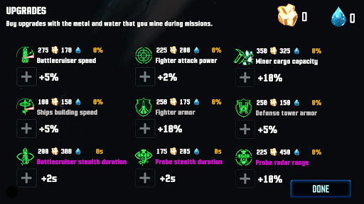 – Upgrades store: trade accumulated metals and water for upgrades for your fleet. Your ships can be faster, stronger and sturdier!