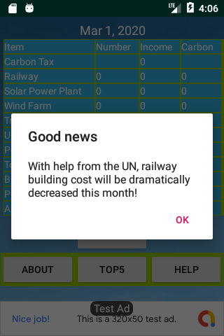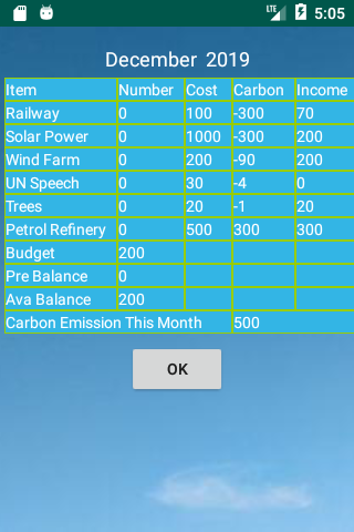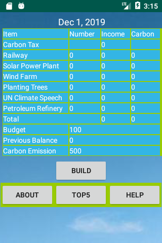 2). You will get some amount of budget every month, but that’s not enough. For collecting money, besides income from the railway, solar power plant, wind farm, and trees, you may build petroleum refinery to make money, but this will add more carbon to the air and will decrease your reputation. You may impose the carbon tax, this may or may not be approved. You will need to consider carefully the cost, income, and carbon effect when building.