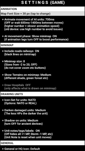+ Settings: Plentiful options to alter the look of the gaming experience: Change difficulty level, hexagon size, what resources are in play, Animation speed, choose icon set for units (NATO or REAL) and cities (Round, Shield, Square, block of houses), decide what is drawn on the map, and much more.