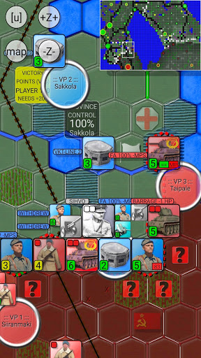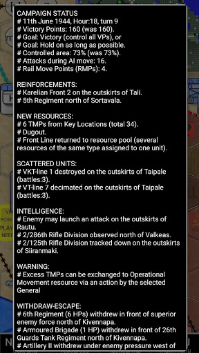 Can you lead the Finnish forces brilliantly enough to stop the massive Red Army offensive that aimed to knock Finland out of the Second World War? The years 1942–1944 were quiet on the Finnish part of the Eastern Front: soldiers did wood whittling, few saw combat, and the wrong places of the front line were fortified, all this while the Red Army was taking lessons in modern warfare from the Wehrmacht. When the Soviet strike finally fell in the summer of 1944, it was a huge, well-practiced attack by a thoroughly trained army with unprecedented artillery barrages against Finns who had just extended their summer holiday leaves. The game ends when you either control all the victory points or have lost control of all the VPs (you held on as long as possible).