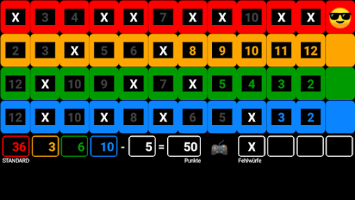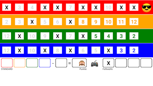 The crosses may only be placed from left to right. If a player places his cross on the last number and has at least 6 crosses in this row, he receives an additional cross in the form of a smiley. If he has less than 6 crosses, the colour row is closed with a lock symbol and the player does not receive an extra cross.
