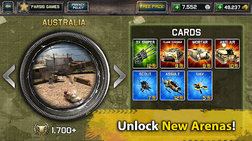 So do you think you are a war strategist? Lets find out by playing Frontline Army Battles against other players around the world. Command your troops in an exciting 3D battlefield, Build powerful card decks at your choice made up of various types of war equipment, Gain Trophies and Glory and rank up among the most glorious commanders world wide!