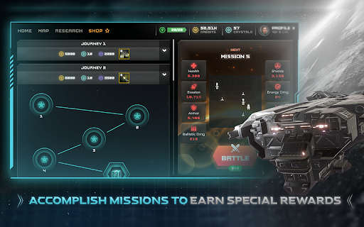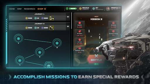 Build & customize each spaceship to help you win battles. Strategize of how you would like each spacecraft to function. Equip your spaceship for Close Range Stance, Medium Range Stance, or Long Range Stance.
