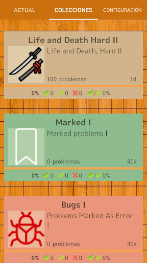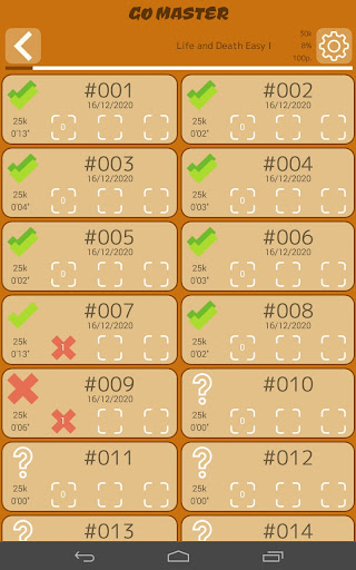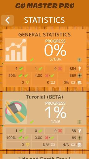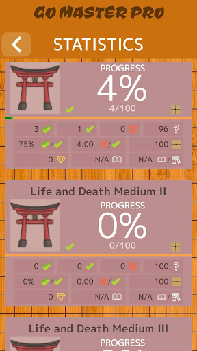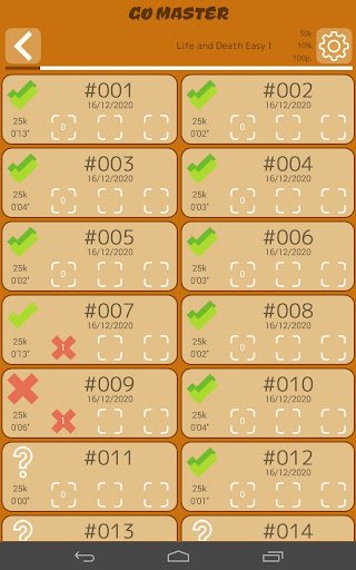 ◼ RECORD OF RESULTS 💾: Go Master Pro will record either if you solve each problem at the first attempt or the number of attempts you needed to complete each one. It will also save the time spent and you can mark your favorite problems, even mark if you think there’s a failure in any problem! Overall and each collection progresses will be recorded.